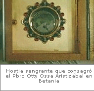 También en Betania se produce un Milagro Eucarístico: una Hostia consagrada comienza a sangrar, y permanece en este estado aún hoy, dando testimonio de la Presencia del Señor en todos los altares del mundo en épocas donde la Eucaristía encuentra una peligrosa falta de Fe en muchos lugares.