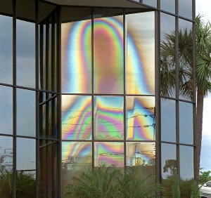 Dibujada por los reflejos de paneles de vidrio que abarcaban dos pisos.