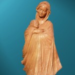 Vestida con el rústico poncho a usanza de los primeros habitantes: el indio, el gaucho. Su cabeza no luce corona, sino que la cubre un pequeño velo; en actitud de caminante, como primera misionera.