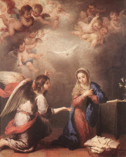 Annciación del ángel a MaríaEn el saludo del ángel, se llama a María «llena de gracia»; en griego el término «gracia»,charis, tiene la misma raíz lingüística de la palabra «alegría». También en esta expresión se clarifica ulteriormente la fuente de la alegría de María: la alegría proviene de la gracia; es decir, proviene de la comunión con Dios, del tener una conexión vital con Él, del ser morada del Espíritu Santo, totalmente plasmada por la acción de Dios. María es la criatura que de modo único ha abierto de par en par la puerta a su Creador, se puso en sus manos, sin límites. Ella vive totalmente de la y en relación con el Señor; está en actitud de escucha, atenta a captar los signos de Dios en el camino de su pueblo; está inserta en una historia de fe y de esperanza en las promesas de Dios, que constituye el tejido de su existencia. Y se somete libremente a la palabra recibida, a la voluntad divina en la obediencia de la fe.