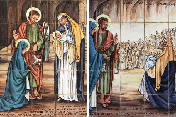 Cuarto dolor: Simeón los bendijo, y dijo a María, su madre: Mira, éste ha sido puesto como signo de contradicción para que se descubran los pensamientos de muchos corazones (Lc 2, 34-35).