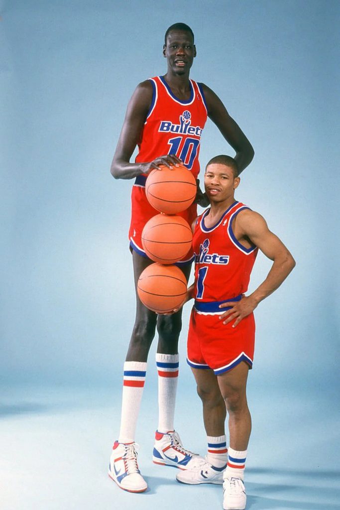Con un abuelo de 2,39 m, un padre de 2,03 m, una madre de 2.08 m, Manute Bol llegó a alcanzar los 2,31 m, en un cuerpo de 92 kilos. Sin duda, una proeza de Dios, sostener tantos centímetros con una envergadura tan liviana. Se cuenta que cuando hizo su primer mate en una canasta, se comió literalmente el aro y perdió algún diente. Años después le serían repuestos en Estados Unidos.