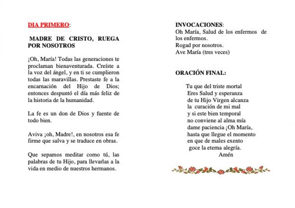 Animado yo de gran confianza, a Vos, Oh Madre, acudo para conseguir, por vuestra poderosa mediación, el don de la salud, si conviene para mi alma. Deseo emplear mi vida, mi salud y mis fuerzas en cumplir la divina voluntad.
