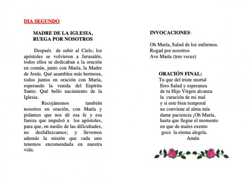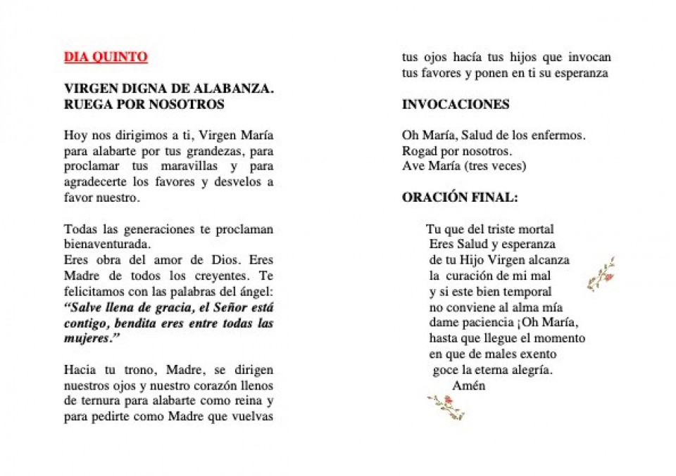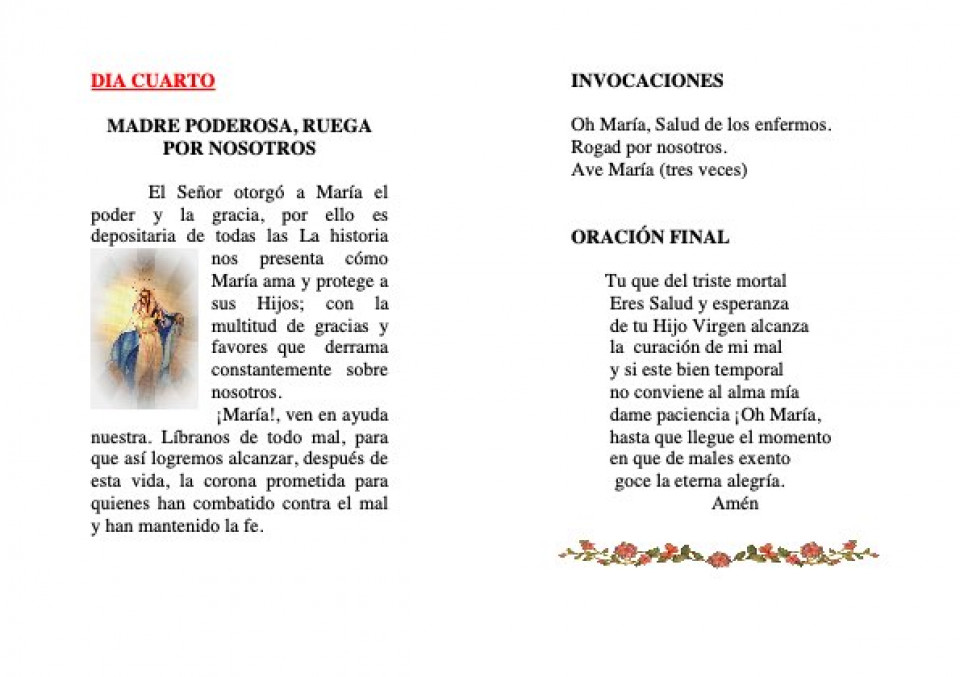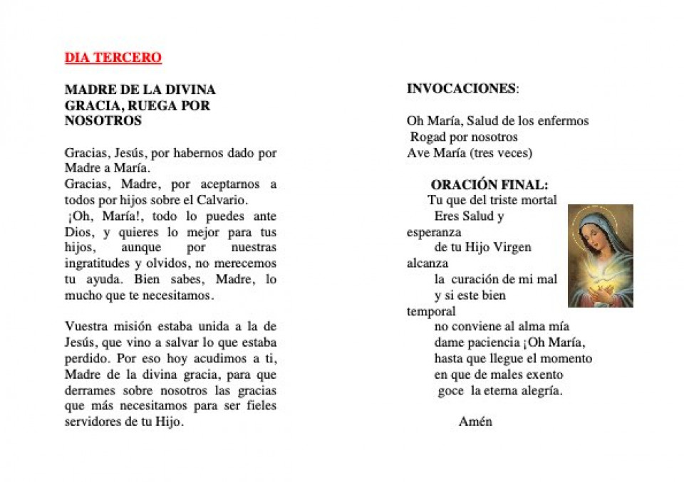 ( Un Padrenuestro, y tres Avemarías, añadiendo la invocación: OH María Salud de los enfermos, rogad por nosotros.)