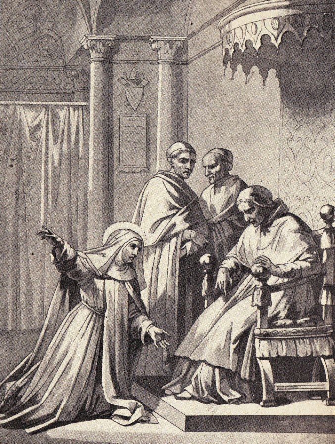 La santa tuvo otra misión durante su viaje a Avignon. El Papa Gregorio IX, electo en 1370, tenía su residencia en Avignon, donde los cinco papas previos también habían residido. Los romanos se quejaban de que sus obispos habían abandonado su iglesia durante setenta y cuatro años, y amenazaron con llevar a cabo un cisma. Gregorio XI hizo un voto secreto para regresar a Roma; pero no hallando este deseo agradable a su corte, el mismo consulto a Santa Catalina acerca de esta cuestión, quien le respondió: “Cumpla con su promesa hecha a Dios.” El Papa, sorprendido de que tuviera conocimiento por revelación lo que jamás había revelado a nadie, resolvió inmediatamente hacerlo. La Santa pronto partió de Avignon. Se cuenta con varias cartas escritas por ella y dirigidas al Papa, a fin de adelantar su retorno a Roma, en donde finalmente falleció en 1376.