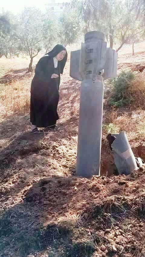 La foto que acompaña esta noticia, es la de una religiosa junto a un misil. La imagen comenzó a circular en las redes sociales. Es el proyectil que cayó el 23 de octubre en el jardín un convento carmelita en Alepo (Siria), y que no explotó, salvando sus vidas las hermanas religiosas. Esto sucedió mientras las religiosas estaban celebrando la Eucaristía.