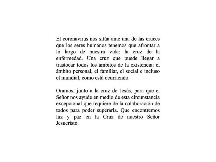 Estos días en el que, prácticamente, el mundo entero está en cuarentena, y al mismo tiempo viviendo una Cuaresma sin precedentes, invitamos a rezar este Via Crucis especial y pedimos a Nuestra Madre Santísima, la Virgen María y a nuestro Padre Dios y a su Hijo Jesucristo, que nos proteja de esta pandemia. Confiamos en ellos.