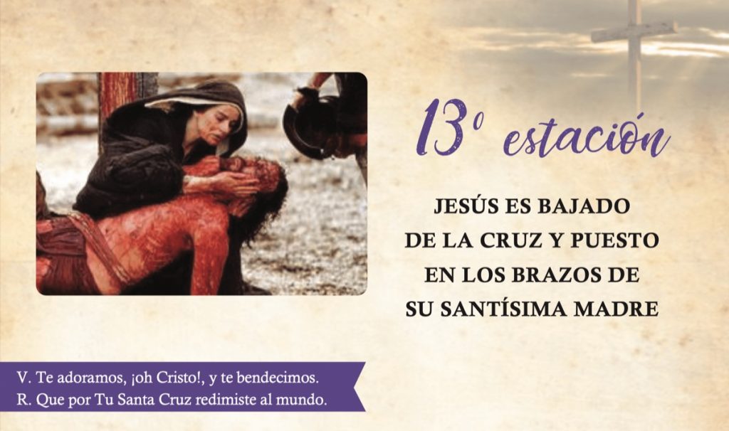 Jesús es bajado de la Cruz y entregado a Su divina Madre, quien le recibe entre sus brazos y contra su corazón, ofreciéndolo a Dios como víctima de nuestra salvación.
