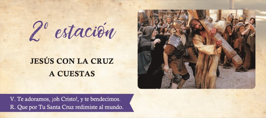 En Jerusalén, los judíos imponen a Jesús una pesada e ignominiosa cruz, que era considerada entonces como el instrumento de suplicio propio del último de los hombres. Jesús recibe con gozo esta cruz abrumadora; apresúrase a recibirla, la abraza con amor y la lleva con dulzura.