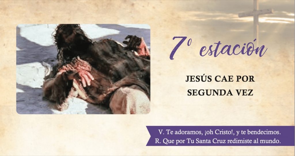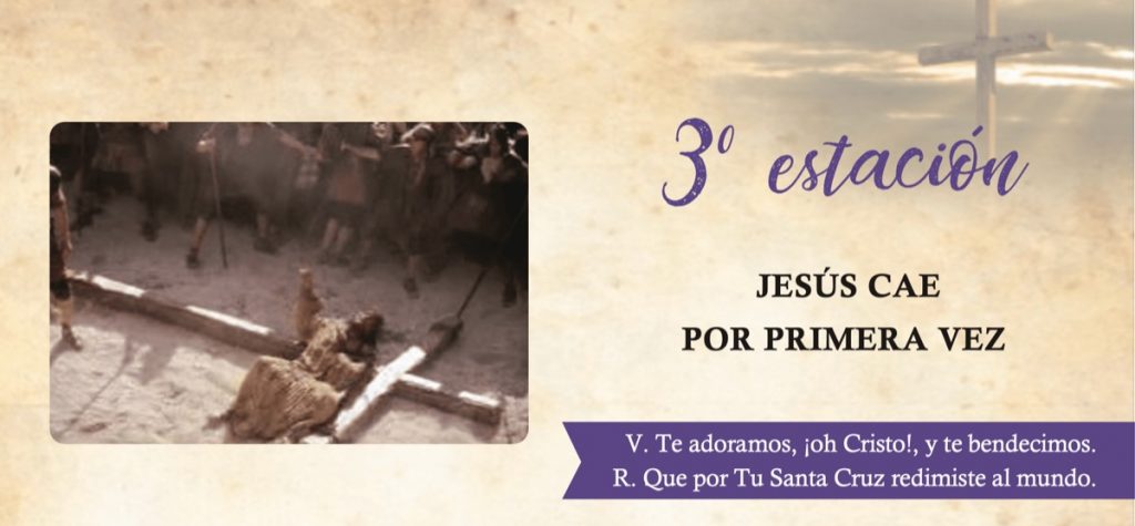 Tan agotado de sangre se vio Jesús después de tres horas de agonía y de los golpes de la flagelación, tan debilitado por la terrible noche que pasó bajo la guardia de sus enemigos, que, tras algunos momentos de marcha, cae abrumado bajo el peso de la cruz.