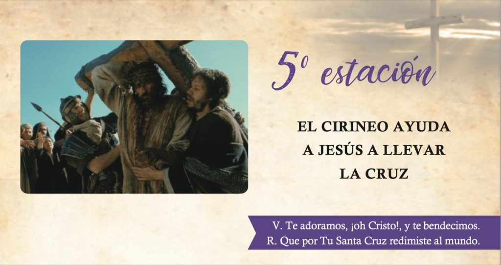 Jesús aparecía cada vez más rendido bajo su peso. Los judíos, que querían que muriese en la cruz, para poner el colmo a sus humillaciones, pidieron a Simón el Cirineo que tomase el madero. Negóse él, y menester fue obligarle para que tomara este instrumento que tan ignominioso le parecía. Mas aceptó al fin y mereció que Jesús le tocara el corazón y lo convirtiera.