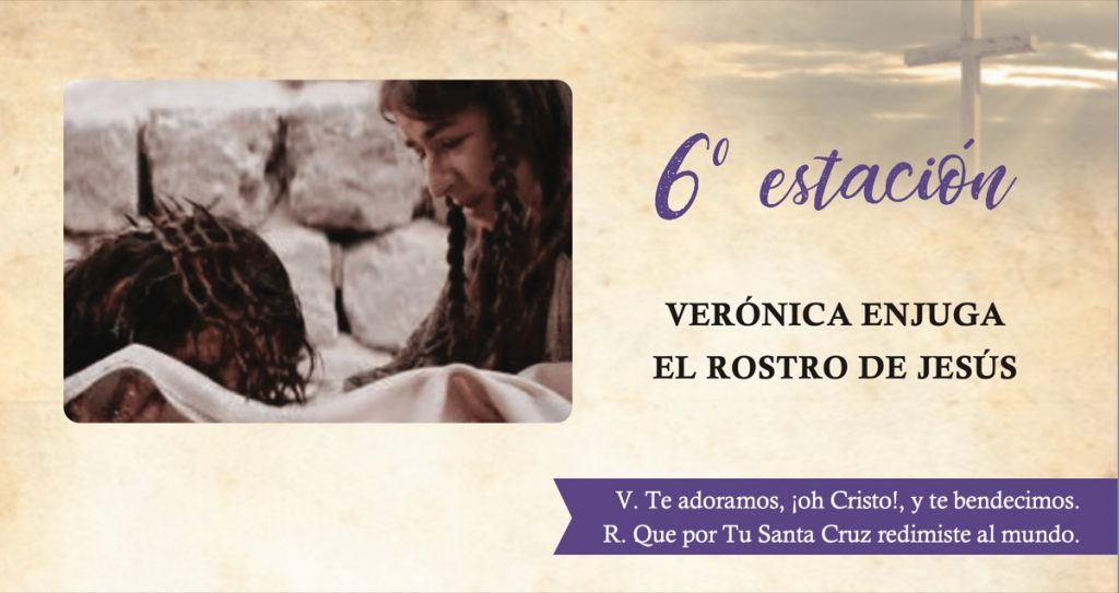 El Salvador ya no tiene rostro humano; los verdugos se lo han cubierto de sangre, de lodo y de esputos. El esplendor de Dios se encuentra en tal estado, por lo cubierto de manchas, que no se le puede reconocer. La piadosa Verónica afronta los soldados; bajo las salivas ha reconocido a su Salvador y Dios, y movida de compasión enjuga su augusta faz. Jesús la recompensa imprimiendo sus facciones en el lienzo con que ella enjuga Su Cara adorable.
